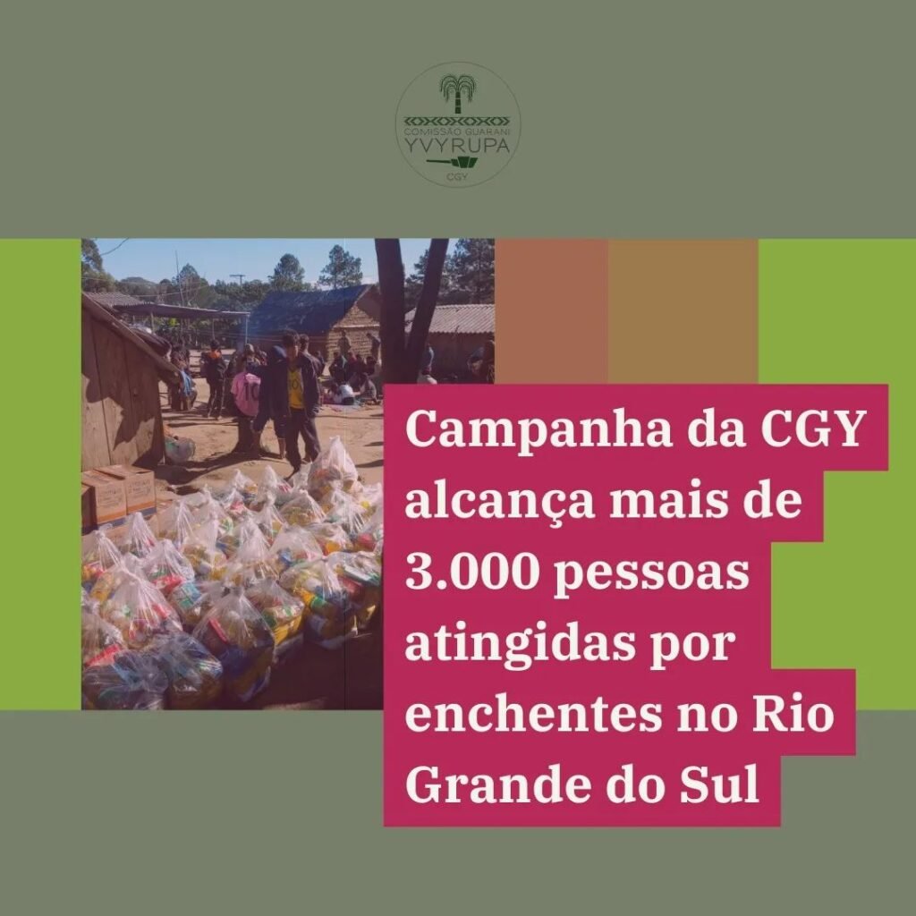 Rede de solidariedade destinou toneladas de alimentos, água e itens básicos Por Assessoria da CGY A campanha de apoio emergencial lançada pela Comissão Guarani Yvyrupa em apoio às famílias indígenas atingidas pelas enchentes no Rio Grande do Sul alcançou seu objetivo: formar uma rede de solidariedade para que as comunidades tivessem com quem contar no momento mais crítico dos impactos do evento climático. As arrecadações de nossa campanha trouxeram um mínimo de alívio em meio à calamidade, assegurando às comunidades indígenas itens essenciais e condições para a sobrevivência e condições para o enfrentamento aos impactos da devastação. Num primeiro momento, os auxílios foram destinados para a garantia de itens básicos para a segurança alimentar e acesso à água potável. No total, foram distribuídas 20 toneladas de alimentos, para 37 tekoa (aldeias),que também receberam água potável e itens básicos, como cobertores e colchões, alcançando 674 famílias, somando mais de 3.300 pessoas, em diversas regiões do estado do Rio Grande do Sul. Contamos com a ampla colaboração de diversos parceiros, pessoas, coletivos e organizações, que contribuíram com valores, e, especialmente, com confiança na seriedade do trabalho da CGY. Ao longo de 20 dias, no mês de maio, nos empenhamos em mapear, preparar e estabelecer planos de logística para que os apoios em forma de cestas básicas e outros itens fossem entregues nas aldeias do povo Guarani. Temos muito ainda a fazer no momento de reconstrução da vida e das aldeias na região. A CGY reafirma o entendimento do povo Guarani de que eventos climáticos extremos como este ocorrem em consequência da exploração predatória da terra, com o uso desordenado de recursos naturais e o desmatamento descontrolado que atingem as florestas, águas e solo dos biomas Mata Atlântica e Pampa, os quais os povos indígenas têm lutado incansavelmente para proteger. Publicado originalmente em: https://www.yvyrupa.org.br/2024/06/22/campanha-da-cgy-alcanca-mais-de-3-000-pessoas-atingidas-por-enchentes-no-rio-grande-do-sul/