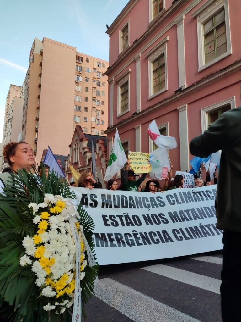 Na sexta-feira (31/05), vozes ecoaram pela capital gaúcha alertando que as enchentes que atingem o RS têm causas e culpados. A juventude organizada, partidos políticos, movimentos sociais, organizações ambientalistas e pessoas afetadas estiveram na Marcha pelo Clima, ato organizado pelo Eco Pelo Clima junto a outras organizações, como a União Estadual dos Estudantes. Embalado por cantos como “essa chuva não é normal, capitalismo é desastre ambiental” e “Do Lami ao Sarandi, prefeito Melo eu não te vi”, somados a gritos de “Fora Leite” e “Fora Melo”, o ato denunciou o descaso de governantes com o povo e a responsabilidade do sistema capitalista na emergência climática. Destacou, ainda, a relação da devastação da natureza, imposta por projetos políticos que colocam o lucro acima da vida, com o atual cenário de enchentes no RS. A tragédia também é política. E na receita deste caos anunciado, está a decisão do prefeito de Porto Alegre, Sebastião Melo (MDB), assim como do governador do estado, Eduardo Leite (PSDB), em ignorar avisos há tanto proferidos por ambientalistas, movimentos sociais, organizações por justiça socioambiental e cientistas. Está, também, a falta de investimento destes em políticas públicas e as ações de desmonte e sucateamento do que é público. Nas privatizações massivas, no desmonte da proteção ambiental e no avanço do agronegócio, da mineração e da especulação imobiliária, que nos trazem a um profundo desequilíbrio ecológico. Na concentração do ato, na Esquina Democrática, uma faixa anunciava: “Essa enchente é movida a carvão”. O RS concentra 90% das reservas de carvão do Brasil, e é o estado cotado para ser “a nova fronteira minerária do país”. Junto ao petróleo e ao gás, figurando na indústria fossilista, o carvão é um dos principais fatores de emissão de CO2 na atmosfera, gás de efeito estufa que mais acelera o aquecimento global e a emergência climática. O governo de Eduardo Leite privatizou serviços complicando o acesso e a qualidade destes, dilacerou o código ambiental do RS, flexibilizou a legislação ambiental e abriu brecha para que grandes empresas e os ricos que lucram com o carvão, com a mineração, cravem suas garras em territórios de vida. O mesmo ocorre quanto ao agronegócio, outra atividade de alto impacto socioambiental negativo e que nos traz a emergência climática – defendida por Leite e em expansão no RS. Ao menos 20% da geografia do estado é monocultivo de soja para exportação, o que além de tudo nos mantém em uma relação de dependência do capital estrangeiro, minando a soberania. Todos estes são fatores que agravam a situação trágica, hoje vivida na pele por mais de dois milhões de gaúchos afetados. De acordo com a última atualização da Defesa Civil (01/06 – 9h), são 475 municípios afetados, 37.812 pessoas em abrigos, 580.111 desalojadas, 806 feridas, 43 desaparecidas e 171 óbitos confirmados. Em marcha até o Palácio do Piratini, o ato contou com falas salientando que o povo não merece cidades provisórias ou de lona, como as que Sebastião Melo insiste em implementar, em total descaso com o povo, especialmente jovem, negro, ribeirinho, indígena e periférico. Houve denúncia da cidade provisória que o Prefeito Sebastião Melo insiste em querer criar no Complexo do Porto Seco. Na mesma data do ato, 31 de maio de 2024, Melo anunciou pela manhã plano realizado com apoio da Alvarez & Marsal, especialista em processos de gentrificação social e privatização, além de limpeza de nome dos responsáveis por tragédias. No ato foi abordado o racismo ambiental que eclode em solo gaúcho, e que também existe na Palestina ocupada, que vive um processo de colonização e genocídio pelo Estado de Israel. Pauta presente, que contou também com fala e momento de silêncio em respeito às vítimas palestinas do processo de colonização, apartheid social, violência e limpeza étnica promovida pelo Estado de Israel contra o povo palestino. Após segunda concentração do ato pelo clima, no Palácio do Piratini, manifestantes se somaram a outra manifestação, que teve ponto de encontro no Largo do Zumbi dos Palmares e foi organizada por moradores e comerciantes do bairro Cidade Baixa, também afetado pela enchente. A marcha seguiu pelas ruas do bairro, pautando com mais força o Fora Leite e Fora Melo. Não há justiça climática sem justiça social. O mesmo sistema capitalista, racista e patriarcal que causa a morte de rios, florestas e biomas, é o que retira direitos da classe trabalhadora, suas casas, sua saúde, as condições de vida digna e os territórios dos povos. Quando um território é afetado, todos são. As fronteiras coloniais impostas pelo mundo capitalista não nos servem, e tampouco as águas que avançam após serem represadas por projetos de morte pedem licença para passarem de uma fronteira a outra. Que na confluência das lutas, e nesse entendimento, sejamos capazes de somar forças e organizar a revolta. Demandando direitos, a começar pelo investimento em políticas públicas que considerem a emergência climática, construídas a partir das demandas e necessidades dos territórios, e em diálogo permanente com atingides. Seguimos na luta! Leia também a nota de posicionamento da Amigas da Terra Brasil “INUNDAÇÃO NO RS: A emergência é climática, a responsabilidade é política. A solidariedade, a nossa força”