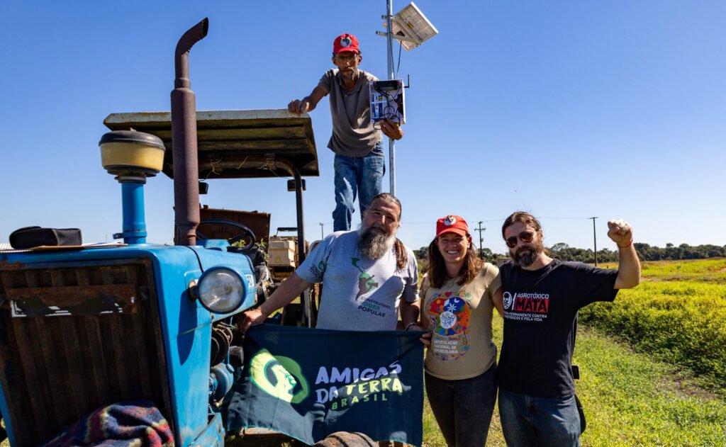 A quarta-feira (30/04) foi marcada por um passo importante no fortalecimento da agroecologia e da vigilância popular. A ATBr, junto a pessoas assentadas da reforma agrária, iniciou a instalação de uma estação climatológica no Assentamento Santa Rita de Cássia, área de produção do Movimento Sem Terra (MST), em Nova Santa Rita (RS). O objetivo é fortalecer o território e sua autonomia. A partir da estação serão coletadas informações que podem beneficiar a produção de alimentos, assim como a defesa dos assentamentos e das famílias em casos de violação de direitos. A região sofreu fortes impactos na enchente e é afetada há anos por derivas das pulverizações aéreas de agrotóxicos. Venenos aplicados em granjas próximas contaminam o ambiente, a produção de alimentos e a saúde, prejudicando o campesinato e suas formas de vida. A estação climatológica qualifica as informações das comunidades em defesa de seus territórios. É um instrumento para monitoramento do local e de ameaças, e permite que dados quanto às condições climáticas (medição da temperatura, do vento, de sua velocidade e direção) sejam registrados. “A estação vai dar uma força muito importante para a agroecologia e produção de alimentos”, expôs o assentado Arnaldo Soares Borges. O produtor contou sobre limitações que dificultam o trabalho, como eventos climáticos extremos da emergência climática e conflitos com o agronegócio. “A estação tem dois objetivos: a gente se apropriar do clima para desenvolver melhor a produção e fortalecer a resistência na produção agroecológica. Tivemos períodos de conflito com a deriva de agrotóxicos na região e essa ferramenta é uma fortificante para a resistência, com objetivo de combater as derivas”, explicou. “O assentamento vai ter autonomia de ter seus dados, gerados e colhidos pela própria comunidade. Caso ocorra nova pulverização área e uma deriva seja percebida, a gente vai saber instantaneamente e poder correlacionar com dados da estação. O projeto é uma forma de segurança. A própria estação é símbolo de vigilância comunitária”, apontou Eduardo Raguse (ATBr). Também está prevista a instalação de estações meteorológicas em assentamentos de Eldorado do Sul e Tapes. Seguimos ✊🏼 Confira nas redes e compartilhe: 📍 Instagram 📍 X 📍 Facebook 📍 Flickr