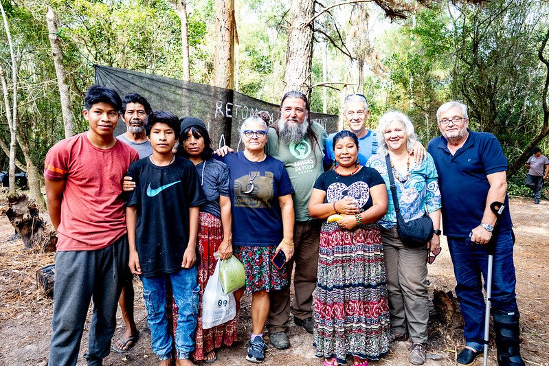 No dia 3 de maio, duas famílias Mbyá Guarani retomaram uma área por elas reconhecida como território ancestral, localizada na Estrada São Caetano, no bairro Lami, em Porto Alegre (RS). A retomada foi nomeada pelos Mbyá como Ka’aguy Mirim, que em tradução livre significa “Mata Sagrada”. Na quarta-feira (14/05), a retomada Ka’aguy Mirim recebeu a visita de representantes de instituições que atuam na defesa dos direitos dos povos indígenas. Estiveram presentes o Ministério Público Federal, representado pelo procurador Ricardo Gralha Massia; a Fundação Nacional dos Povos Indígenas (Funai), por meio de Kaio Domingues Hoffmann; e o Conselho Estadual de Direitos Humanos do RS (CEDH/RS), com Silvio Jardim. A visita teve como objetivo ouvir a comunidade e a cacica Yvá Mônica, diante das ameaças que os indígenas relatam estar sofrendo por parte de não indígenas que reivindicam a posse da área. Empreendimentos imobiliários e posseiros colocam em risco de extinção as matas e ambientes nativos. Com essa expansão urbana e imobiliária, os indígenas, como os Mbyá da retomada, vão perdendo seus espaços de sobrevivência. É preciso garantir esses territórios de vida. Durante a visita, foram discutidos encaminhamentos importantes relacionados à segurança da comunidade Mbyá Guarani, ao fornecimento de água e alimentos e à garantia de livre trânsito para apoiadores da aldeia e para os próprios parentes indígenas. Além das instituições federais e estaduais, também estiveram presentes representantes da Prefeitura de Porto Alegre, por meio do CRAS (assistência social), e diversas organizações da sociedade civil que vêm oferecendo apoio contínuo à retomada. Entre elas, destacam-se o Conselho Indigenista Missionário (CIMI), a Amigas da Terra Brasil (ATBr) e Madre Tierra, que acompanham de perto o processo de retomada e os desafios enfrentados pela comunidade indígena no território. A Amigas da Terra Brasil se coloca contra o racismo ambiental e os projetos de morte. Garantir a segurança dos Mbyá da retomada e seu modo de viver é fundamental. Em apoio aos projetos de vida, seguimos na luta em defesa das retomadas! Crédito da foto: Maí Yandara/ ATBR Galeria de fotos no Flickr da Amigas da Terra Brasil Amigas da Terra Brasil