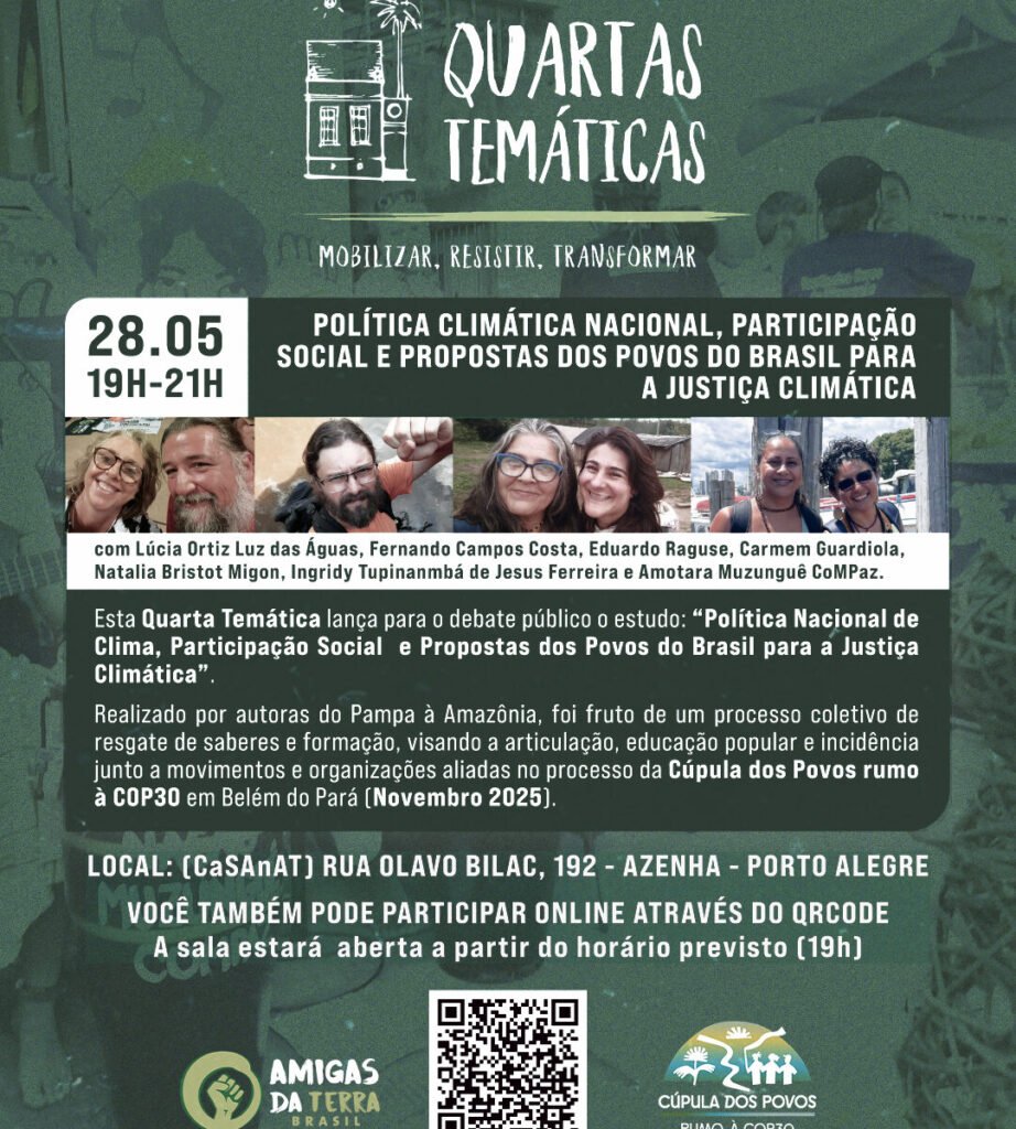 A Amigas da Terra Brasil volta a realizar a Quarta Temática, um espaço de encontro mensal de debate e trocas de experiências, no dia 28 de maio, às 19h, na CasaNat (Rua Olavo Bilac, 192), nossa sede em Porto Alegre (RS). Teremos transmissão ao vivo para todo o país! Nesta Quarta Temática, lançaremos para debate público o estudo . Realizado por autoras e autores do Pampa à Amazônia, foi fruto de um processo coletivo de resgate de saberes e formação, visando a articulação, educação popular e incidência junto a movimentos e organizações aliadas no processo da Cúpula dos Povos rumo à COP30 (Conferência sobre Mudanças Climáticas da ONU), que acontecerá em Belém do Pará, em novembro de 2025. O estudo faz um breve resgate das COPs na América Latina, abordando de forma crítica a participação social na construção das metas nacionais e das política de clima em disputa. Convergindo com as propostas populares em curso, traz também à discussão a Justiça Climática na perspectiva dos povos indígenas, tradicionais e das mulheres amazônidas. Convidamos todas as pessoas interessadas, amigas e companheiras de luta a debaterem com a gente na CaSAnAT! Para quem não puder estar presencialmente, poderá acompanhar ao vivo por este link: https://bit.ly/quarta_tematicaclima (também no QRCode da imagem).