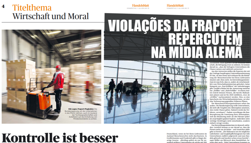 Grandes jornais da Alemanha tem alertado a população local sobre as violações de direitos por parte da Fraport nas obras do aeroporto Salgado Filho, em Porto Alegre. Para a sequência dos trabalhos, cerca de 1.500 famílias da Vila Nazaré perderão suas casas; entretanto, a transnacional alemã não assume sua responsabilidade na realocação da comunidade – e o contrato de concessão é claro: a responsabilidade pelo reassentamento das famílias da Nazaré é sim da Fraport. Ministérios Públicos Federal e Estadual e Defensorias Públicas da União e do Estado já acionaram a empresa na Justiça. Uma articulação entre Amigos da Terra Brasil e Amigos da Terra Alemanha tem feito circular também no país europeu essas notícias sobre as violações da Fraport. Veja abaixo a íntegra dos textos que foram publicados na Alemanha, traduzidos para o português: Frankfurter Rundschau: “Aeroporto de Porto Alegre: Fraport cria fatos”. De Jutta Rippegather Lia Polotzek, especialista em comércio do BUND [Amigos da Terra Alemanha], denuncia o comportamento da empresa operadora do aeroporto de Frankfurt em Porto Alegre, Brasil. A Fraport assumiu a operação do aeroporto de Porto Alegre no início de 2018 e agora pretende expandir a pista e os terminais. Para abrir caminho, milhares de pessoas vão perder suas casas. O Ministério Público interveio. Lia Polotzek, da BUND, está em contato com organizações locais. Sra. Polotzek, na assembleia geral da Fraport, a empresa já havia sido criticada pela sua atuação em Porto Alegre. O que você ouve do Brasil? As pessoas vão ser divididas e reassentadas em dois lugares. Um deles não possui cuidados de saúde adequados nem oportunidades educacionais, e com alto grau de violência. O local não é bem conectado ao transporte público. Quem trabalha com coleta de lixo vai perder seu modo de sustento; muitas das pessoas na Vila Nazaré vivem da reciclagem. De quantas pessoas estamos falando? Segundo a Amigos da Terra Brasil, são cerca de 2 mil famílias. E como se comporta a Fraport? Não informa as pessoas diretamente. Muita gente soube do que estava acontecendo através de notícias na televisão e no jornal. A empresa não quer pagar uma compensação adequada. Enquanto os cálculos oficiais supõem que os reassentamentos custariam cerca de R$ 150 milhões e a promotoria pública exige que a Fraport levante esses fundos, a empresa queria fornecer apenas R$ 29 milhões em fevereiro. Quando a promotoria pública interveio? Estava ativa já há algum tempo e fez a sua recomendação no início de fevereiro [sobre responsabilização da Fraport]. Afirmou também claramente que a Fraport é totalmente responsável pelo realojamento das famílias. A empresa se opôs. Houve negociações que não conduziram a um acordo. No início de junho, o Ministério Público tornou isto público, chamando a atenção para o fato de poder agora entrar com uma ação judicial contra a Fraport [o que de fato aconteceu]. Quem está à frente nesta luta na Vila Nazaré? Muitas das pessoas vivem abaixo do limiar da pobreza. A Amovin (Associação dos Moradores da Vila Nazaré) representa os interesses dos moradores. O MTST (Movimento dos Trabalhadores Sem-Teto) está ativo e nossa organização parceira, a Amigos da Terra Brasil, está também contribuindo. Quais são as exigências sobre a Fraport? Eles devem assumir a responsabilidade pelo reassentamento, pagar a compensação adequada e respeitar o direito à moradia, apresentando uma nova alternativa. As primeiras remoções voluntárias já começaram, o que significa que a Fraport está criando fatos. Não deve haver reassentamento forçado em nenhuma circunstância. Então a Fraport não seria capaz de expandir a pista. Há alternativas de moradia que estão mais próximas da região da Nazaré; e parte da terra é de propriedade pública. É melhor do que dividir a comunidade: são pessoas que vivem juntas há 60 anos. A Fraport alega que a comunidade é um assentamentos ilegal. Isso não é verdade, diz o Ministério Público. Por que a BUND se envolveu? Em todo o mundo, as violações dos direitos humanos e a destruição ambiental andam de mãos dadas. Trata-se de uma expansão aeroportuária prejudicial para o clima e, ao mesmo tempo, as pessoas estão perdendo suas casas sem uma compensação adequada. Isso tudo para que algumas pessoas privilegiadas possam utilizar o aeroporto para expandir o comércio. Os interesses da economia estão na linha da frente, não os das pessoas ou do ambiente. Sobre a pessoa: Lia Polotzek é consultora em economia, finanças e comércio no Bund für Umwelt und Naturschutz (BUND – Amigos da Terra Alemanha). Ela lida com a política comercial da UE, a responsabilidade corporativa pelo ambiente e pelos direitos humanos e a transformação sócio-ecológica da economia. O aeroporto de Porto Alegre (RS) oferece conexões com importantes cidades brasileiras e destinos internacionais. Em março de 2017, foi cedido à Fraport um contrato de concessão para o aeroporto com um prazo de 25 anos. Wirtschaftswoche: “Brasileiros processam Fraport por remoções forçadas” EXCLUSIVO / De Jacqueline Goebel e Rüdiger Kiani-Kreß / 11 de Julho de 2019. A operadora do aeroporto de Frankfurt também assumiu a operação do aeroporto brasileiro de Porto Alegre no início de 2018. A Fraport, operadora aeroportuária, está enfrentando longos processos judiciais no Brasil relativos à expansão do aeroporto em Porto Alegre. O Ministério Público Federal do Brasil obteve uma ordem contra a Fraport que pode atrasar significativamente a expansão da pista. Isso se deve a ações judiciais movidas por moradores locais cujos reassentamentos devem ser liberados para o projeto. A Fraport deve cumprir a sua responsabilidade também em termos financeiros e apresentar um “plano de reassentamento apropriado”, de acordo com a ordem disponível à WirtschaftsWoche. Cerca de 1.300 a 1.700 