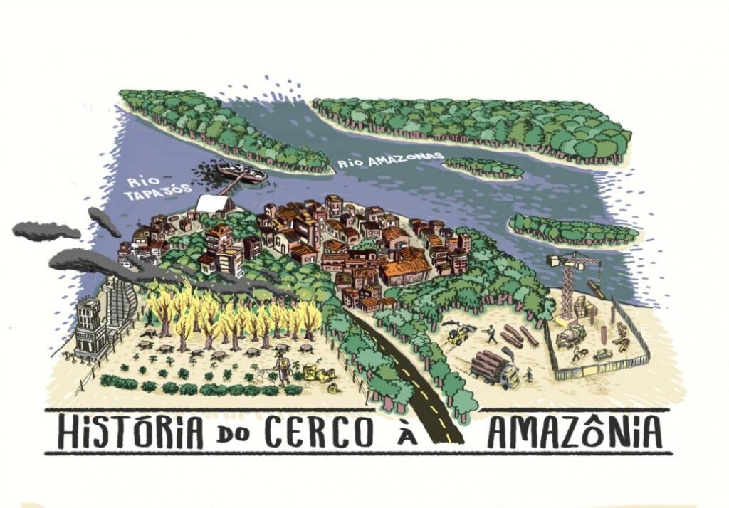 No vídeo abaixo, o presidente do Sindicato dos Trabalhadores Rurais, Agricultores e Agricultoras Familiares de Santarém (STTR-STM), Manoel Edivaldo Santos Matos, o Peixe, explica, a partir de um mapa da região do Tapajós, o cerco do capital à Amazônia: Santarém: um Plano Diretor sob medida para a expansão do capital na AmazôniaNa última sessão legislativa de 2018, ignorando por completo toda a participação popular que havia acontecido até ali, os vereadores de Santarém – sem vergonha alguma – aprovaram a Lei nº 20534, que institui um novo Plano Diretor para a cidade: um plano feito sob medida para sojeiros, ruralistas em geral, grileiros, investidores de megaprojetos, garimpeiros e para a indústria do turismo. Essa é a primeira história da reportagem “A história do cerco à Amazônia”. Navegue pelos conteúdos: INTRODUÇÃOParte 1 (página central): A história do cerco à AmazôniaParte 2: Quem é favorecido com as respostas de Bolsonaro às queimadas?Parte 3: O “ganha-ganha” das empresas com a financeirização da naturezaParte 4: Mas afinal, quem está por trás desses crimes? HISTÓRIAS1) [você está aqui] O cerco explicado em um mapa2) Um porto entalado na boca do rio De um lado, ampliou-se a área portuária, convenientemente envolvendo toda região do Lago Maicá, onde há planos para a construção de cinco portos privados voltados ao escoamento da soja. De outro, cresceu a zona urbana, o que permite a construção de prédios e empreendimentos turísticos à beira do Rio Tapajós. Isso envolve toda a área em direção a Alter do Chão, considerada uma das praias mais bonitas do Brasil e que foi foco das queimadas em 2019. Ora, nada é por acaso, e o ciclo se repete: queimadas, grilagem, venda ilegal da terra – seja para a expansão do agronegócio, seja para a venda de lotes para indivíduos ou para empreendimentos turísticos. De toda forma, significa violência contra os povos e comunidades locais e a derrubada da floresta. Fecha-se o cerco: madeireiros ilegais; grilagem; soja; agrotóxicos; pecuária; portos; mineração; ferrovias; contaminação do solo e das águas; especulação imobiliária; expulsão de famílias quilombolas, indígenas e de pequenas e pequenos agricultores para as periferias da cidade; ameaças e ataques a quem resiste. Repetimos: não há convivência possível com o ciclo de morte do capital. Voltar para a página central “A história do cerco à Amazônia“ Leia também as partes 2, 3 e 4 da introdução:– Quem é favorecido com as respostas de Bolsonaro às queimadas?– O “ganha-ganha” das empresas com a financeirização da natureza– Mas afinal, quem está por trás desses crimes? Ou avance para a próxima história:– Um porto entalado na boca do rio