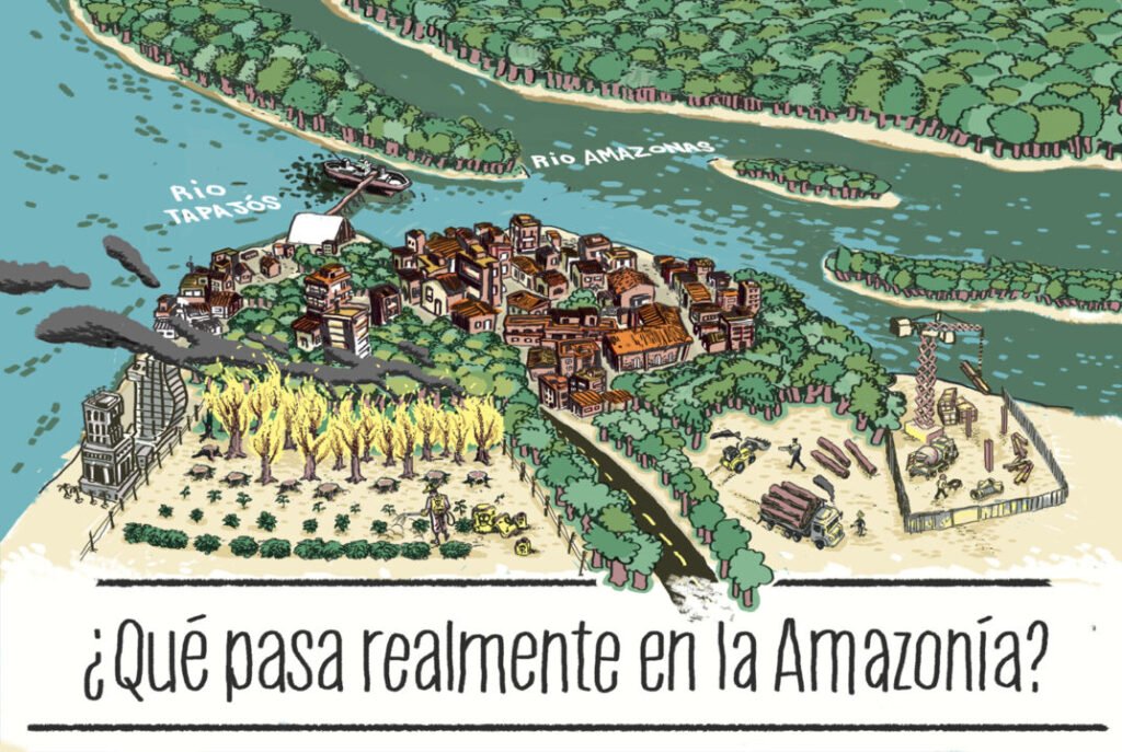 Ya hemos hablado mucho sobre el Mercado, las Empresas, la Industria, los Ruralistas. Sin embargo, estas entidades trascendentales tienen nombres, son parte de nuestro mundo, podemos y debemos citarlas para que carguen con su culpa: la industria de la carne, los agronegocios así como sus inversores del mercado financiero son los mayores culpables de los ataques contra los pueblos de la Amazonia y, por supuesto, también son los que más se benefician de ello. Aunque el gobierno actual intente culpabilizar a los estratos más empobrecidos de la sociedad por la devastación de la biodiversidad en la Amazonía y Brasil, un interesante reportaje del The Intercept Brasil comprobó que, por detrás de los incendios y la deforestación, hay entidades poderosas: “Datos públicos del Ibama, agencia del gobierno federal responsable por preservar el medio ambiente, analizados por De Olho nos Ruralistas, muestran que los 25 deforestadores más grandes, en la historia reciente del país, son grandes empresas extranjeras, políticos, personalidades de columnas sociales y incluso una empresa vinculada a un banquero y tres explotadores de mano de obra esclava “. Esta es la parte 4 de la introducción a la historia “¿Qué pasa realmente en la Amazonía?”: Parte 1 (página central): ¿Qué pasa realmente en la Amazonía?Parte 2: ¿Quién se ve favorecido con las respuestas de Bolsonaro a los incendios?Parte 3: El “ganar-ganar” de las empresas con la financiarización de la naturalezaParte 4: [estás aquí] Por fin, ¿quién está detrás de estos crímenes? Vea también: El asedio explicado en un mapa Y en medio de todo esto – la monopolización de tierras, los incendios, la soja y sus pesticidas, los puertos que impiden la pesca, los megaproyectos que destruyen formas de vida que las comunidades resisten, a pesar de la extrema presión y amenazas a la vida. Estas Comunidades y Pueblos terminan transformándose en entidades abstractas, sin embargo, son personas simples y de hábitos comunes: disfrutan del fútbol, del almuerzo familiar, del baño en el río, del descanso en la hamaca. Pequeñas y pequeños agricultores, pescadoras y pescadores, extractivistas de reservas legales, comunidades quilombolas y pueblos indígenas que querían, si fuera una opción, simplemente continuar sus vidas en el lugar al que pertenecen, cuidando de la floresta de la cual dependen. Otro mundo no es posible, solo existe este. Por eso hay que lucharNo es posible coexistir con el deseo infinito de destrucción de la expansión capitalista: su veneno contamina todo, los lagos sufren con la polución y se secan, la tierra está contaminada, las personas son expulsadas de sus territorios, atacadas, cobardemente asesinadas. El discurso de odio de Bolsonaro y las políticas de desmantelamiento de las áreas ambientales y agrarias, en defensa de los intereses de los agronegocios y las grandes industrias extranjeras, se materializan en violencia. Hay que tener en cuenta que los asesinatos de indígenas aumentaron 22.7% en 2018. Para vencer esto, nos queda una lucha continúa: diariamente, con un trabajo de hormigas, poco a poco – tan difícil como necesario y gratificante. Justamente esto es lo que nos enseñan las historias que escuchamos en la reciente visita a la región de Tapajós, Pará. Ellas evidencian la destrucción del capital en el Amazonas, con el monopolio de tierras, el avance de megaproyectos sobre comunidades enteras, el ataque a los bosques y ríos, amenazas a quienes se oponen y defendien las formas de vida tradicionales así como los derechos de los pueblos. No nos resulta sorprendente que estas personas reciban el apodo de Protectoras y Protectores del Bosque – no hay un nombre más justo. Regrese a la página central “¿Qué pasa realmente en la Amazonía?“ Lea también las partes 2 y 3 de la introducción:– ¿Quién se ve favorecido con las respuestas de Bolsonaro a los incendios?– El “ganar-ganar” de las empresas con la financiarización de la naturaleza También confira: El asedio explicado en un mapa