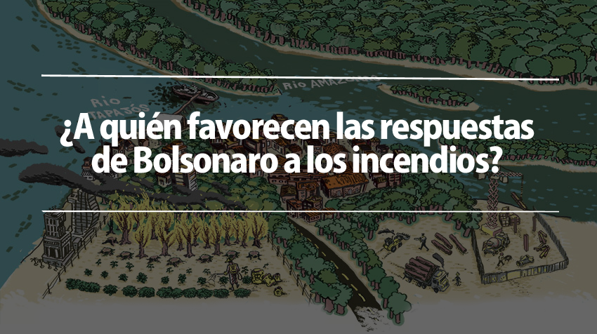 Desde el principio hemos señalado esta respuesta: al mercado financiero, los monopolizadores de tierras, los agronegocios. Y el Proyecto de Ley 2633, legislación diseñada para favorecer el acaparamiento de tierras, es la mayor evidencia de esto. Y bueno… Ricardo Salles, el ministro de Medio Ambiente, también lo dejó bastante claro al decir que la pandemia de coronavirus es una gran oportunidad para desmantelar la regulación ambiental porque todos miran para otro lado. Ante la urgencia y la creciente preocupación de la comunidad internacional en relación con los incendios de 2019, la administración Bolsonaro reaccionó con soluciones dirigidas a intereses financieros, la cuales de ninguna manera cubrían los problemas que enfrentan los pueblos de la Amazonía. Por el contrario, los ponen en más riesgo al favorecer políticas caras a los intereses de los ruralistas y al fortalecer las medidas para la financeirización de la naturaleza. En el Congreso Nacional, los proyectos que fortalecen medidas como el PSA (Pago por Servicios Ambientales) han avanzado, al mismo tiempo que el gobierno aprovechó la oportunidad para amnistiar a los monopolizadores de tierras hasta 2018, expresado en el Proyecto de Ley 2633, llamado “PL de la Grilagem” – fomentando exactamente la práctica que se encuentra detrás del aumento de incendios. En medio de la pandemia de coronavirus, el PL 2633 puede ser votado en cualquier momento en el Congreso Nacional; si se aprueba, facilitará aún más la acción de los invasores de tierras públicas. Para el Grupo Carta de Belém, “la legislación […] permite la liquidación de tierras y bienes públicos a un precio de oferta en favor de los acaparadores de tierras medianos y grandes”, recordando que, mientras tanto, “la reforma agraria y la titulación de los territorios colectivos quedar paralizado “. Esta es la parte 2 de la introducción a la historia “¿Qué pasa realmente en la Amazonía?”. Explore todo el contenido: Parte 1 (página central): ¿Qué pasa realmente en la Amazonía? Parte 2: [usted está aquí] ¿A quién favorecen las respuestas de Bolsonaro a los incendios? Parte 3: El “ganar-ganar” de las empresas con la financiarización de la naturaleza Parte 4: Por fin, ¿quién está detrás de estos crímenes? Acceda también: El asedio explicado en un mapa En resumen, las medidas de pago por servicios ambientales son una forma de monetizar la relación con la naturaleza; dependiendo de los flujos financieros, puede ser interesante mantenerlo o no. Estas medidas no abordan los problemas estructurales del impacto climático y mucho menos protegen a los pueblos y sus territorios: por el contrario, los dejan a merced de las grandes industrias poluentes, que invaden la floresta Amazónica para “compensar” sus violaciones de derechos en otros lugares y la contaminación inherente a sus actividades. Las comunidades pierden autonomía sobre sus propios territorios, transformadas en números activos en la bolsa de valores y “granjas de captura de carbono”, hechos que conducen a la criminalización de prácticas y culturas ancestrales. El documental “Mercado verde: la financiarización de la naturaleza” explica y denuncia las falsas soluciones que el capitalismo propone para los males que él mismo causa. Así la tierra es puesta en favor del estado de ánimo del mercado. A él sirven Bolsonaro y el Ministro de Medio Ambiente, Ricardo Salles, que actúan en detrimento de la agro-social-bio-diversidad de la Amazonía. Y no es por casualidad la elección de estas palabras: el gobierno actual piensa en la Amazonía desde la perspectiva de la “bioeconomía“, es decir, con el sesgo de explotar los bienes comunes en nombre de la ganancia que favorece a unos pocos. Es explícito: para ellos la Amazonía necesita “soluciones capitalistas“, que no serían otras que la devastación, la explotación y la privatización. Volver a la página central Continúa leyendo la introducción: parte 3) El “ganar-ganar” de las empresas con la financiarización de la naturaleza parte 4) Por fin, ¿quién está detrás de estos crímenes?