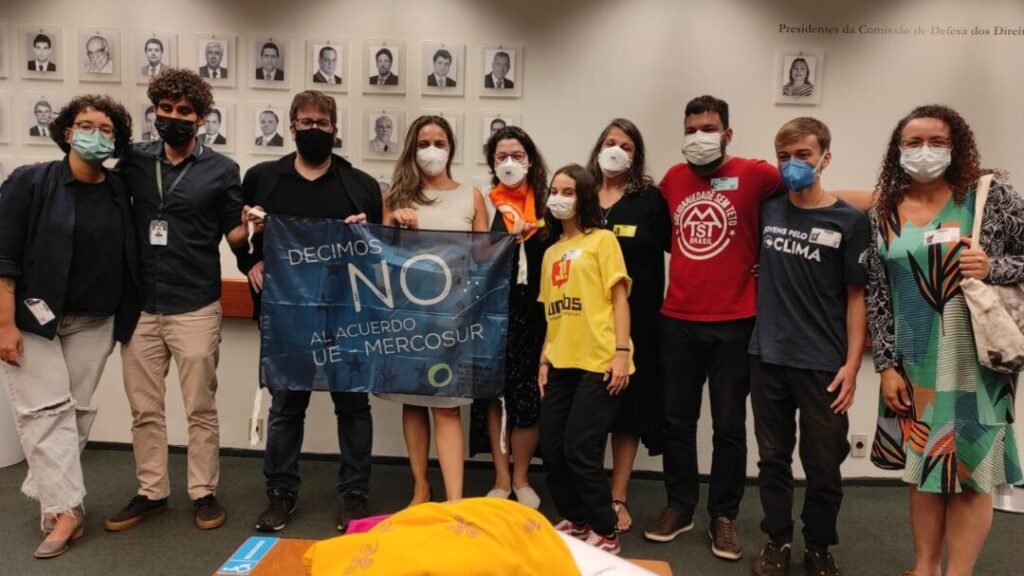 Na 5a feira, (24/03) a Plenária da Frente Brasileira Contra os Acordos Mercosul-União Europeia e Mercosul-EFTA elaborou uma carta aberta dirigida ao Congresso Nacional e a candidatas/as ao parlamento e à presidência em 2022. O evento contou com a participação de diversos representantes de organizações e movimentos sociais, em que se debateu com membros da academia e de partidos de esquerda o cenário geopolítico internacional, as eleições no Brasil e seus desdobramentos para a negociação dos acordos de livre comércio de nova geração. Ambos os acordos apresentam risco de entrar em pauta para ratificação a partir de 2023 sem o devido debate público, que inclua também outras perspectivas de fortalecimento da integração regional. Seu caráter colonial atinge diretamente a vida da população brasileira. Dizemos que o modelo do acordo é neocolonial, pois reforça os países do Mercosul (Argentina, Brasil, Paraguay e Uruguay) como produtores de matéria prima e os países da Europa como países produtores de bens de valor agregado. Nessa relação, se aprofundam as políticas neoliberais do modelo exportador de minérios e commodities, importador de mais agrotóxicos, violador de direitos e privatista de serviços públicos. Confira a carta na íntegra e cobre o posicionamento de deputadas/os e das candidaturas ao Congresso Nacional e ao Executivo Federal: CARTA ABERTA AOS CANDIDATAS/OS AO CONGRESSO NACIONAL E EXECUTIVO FEDERAL No Brasil, os acordos de “livre” comércio de nova geração seguem na agenda do Congresso e têm potencial para entrar em pauta visando à sua ratificação. Caso isso aconteça, atuais candidatos/as ao Legislativo Nacional e à Presidência da República serão convocados a se manifestarem a favor ou contra as propostas de novos acordos de comércio. Em particular, no caso do Acordo entre Mercosul e União Europeia, presentemente em discussão, ficará sob a responsabilidade dos representantes eleitos o rechaço ou a reabertura de negociações. Considerando a aguda transformação da política internacional contemporânea, queremos, com esta carta, trazer à sua atenção os impactos dos acordos comerciais para o aprofundamento do modelo neoliberal: A guerra na Ucrânia tem sido vista por muitos como um ponto de ruptura do cenário de globalização até aqui vigente. A hipótese apresentada por analistas afirma que o conflito pode vir a reconfigurar as dinâmicas da política internacional observadas no último quarto de século. No passado, a abertura comercial e a desregulação financeira em nível global figuravam como dois pilares para a construção da supremacia econômica dos países hegemônicos no sistema internacional, especialmente, os EUA. Hoje, novamente, o comércio e as finanças mostram-se estratégicos tanto para as mudanças no modo de funcionamento do capitalismo quanto para a percepção das oportunidades de acumulação do capital. Comércio e finanças têm sido usados pelo governo brasileiro e seus apoiadores como meios para justificar uma inserção subordinada do país na economia global. A estratégia de participação nas cadeias globais de valor como fornecedor de matérias primas e minerais tem levado ao aumento da exploração minerária e à ampliação das monoculturas do agronegócio para exportação. O avanço da fronteira monocultora aumenta a demanda pela importação indiscriminada de agrotóxicos e outros contaminantes, diminui a biodiversidade e a saúde do povo brasileiro. Ao privilegiar o modelo extrativista, o governo incentiva o desmonte da indústria nacional, prejudicando as políticas de promoção de renda e trabalho digno. Enquanto restringe o financiamento às políticas públicas essenciais à proteção dos direitos humanos, promove o investimento privado nacional e internacional. Há, pois, clara opção pelo mercado em prejuízo da sociedade, conduzindo a uma dinâmica econômica concentradora de ganhos e socializadora das perdas. Este é o caso de projetos de lei em pauta que, em ressonância às expectativas dos novos acordos comerciais, visam à flexibilização do licenciamento ambiental, à legalização de distintas formas de desmatamento e de grilagem, à exploração econômica em terras indígenas, à privatização de serviços públicos essenciais (tais como transporte, saneamento, saúde e educação) e de gestão de parques naturais a empresas transnacionais, assim como à abertura do setor de compras governamentais. É sabido, através das palavras do ex-ministro do Meio Ambiente, Ricardo Salles, que a excepcionalidade da situação de pandemia contribuiu para que o governo “passasse a boiada” sobre a governança ambiental e as políticas sociais. Mais do que isso, no momento do isolamento social, as instâncias legislativas foram, na prática, fechadas à participação social e a política orçamentária foi conduzida sem qualquer transparência, inviabilizando o controle sobre os gastos públicos. A existência do chamado “orçamento secreto” é um escândalo, com o qual não podemos concordar. Alinhada ao processo de desmonte que vem acontecendo com a liderança do governo federal, perpetuar e aprofundar a agenda de violação e retrocessos nos direitos é o que está em jogo nos capítulos dos acordos comerciais com a Europa. O acordo acentua a reprimarização da economia brasileira e atualiza os dispositivos coloniais que mantêm a dependência do país em relação à Europa, além incentivando a violência racista contra povos indígenas, comunidades negras, camponesas e tradicionais. Isto porque o dano ambiental associado à expansão do desmatamento e do agronegócio recai desproporcionalmente sobre os povos negro e indígena (e, em particular, sobre as mulheres). Com tais preocupações, convocamos, junto a mais de 200 organizações e movimentos sociais reunidos na Frente Brasileira contra os Acordos União Europeia-Mercosul e EFTA-Mercosul (Área de 
