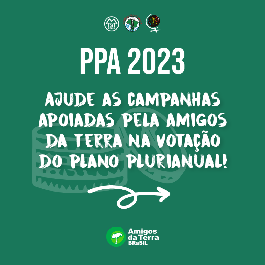 Até esta sexta-feira (14), está aberta votação para que a população decida quais políticas serão prioridade do governo federal. Cada pessoa pode votar em 3 programas de entidades da sociedade civil, além de 3 propostas apresentadas pelo próprio governo para o Plano Plurianual (PPA). A votação é para incidir no principal instrumento de planejamento orçamentário de médio prazo do Governo Federal, o Plano Plurianual (PPA).Ele define as diretrizes, os objetivos e as metas da administração pública federal, contemplando as despesas de capital (como, por exemplo, os investimentos) e outras delas decorrentes, além daquelas relativas aos programas de duração continuada. O PPA é estabelecido por lei, com vigência de quatro anos. Ele se inicia no segundo ano de mandato de um presidente e se prolonga até o final do primeiro ano do mandato de seu sucessor. Conheça e vote nas propostas da Marcha Mundial das Mulheres (MMM), Movimento dos Trabalhadores Sem Teto (MTST) e do Movimento dos Atingidos por Barragens (MAB), apoiadas pela Amigas da Terra Brasil: Programa Periferia Viva (MTST): https://abrir.link/5cUx4 Criação da Política Nacional de Cuidados (MMM): http://abrir.link/nhdit Criação do Fundo Nacional para as populações atingidas por barragens (MAB): http://abrir.link/XHcU7 Essa é a última semana de votação nas propostas para o Plano Plurianual. É possível votar até sexta-feira, 14 de julho. Para votar acesse aqui Caravana do Plano Plurianual (PPA) Participativo realizou plenária no Rio Grande do Sul Em Porto Alegre (RS), a caravana do Plano Plurianual (PPA) Participativo realizou no sábado (08/07) a plenária do Rio Grande do Sul. Propostas de políticas públicas de representantes de diversos segmentos da sociedade civil, como trabalhadores, estudantes, defensores da saúde pública, mulheres e indígenas, foram apresentados aos ministros do Planejamento e Orçamento, Simone Tebet, e da Secretaria-Geral da Presidência da República, Márcio Macedo. Maria do Carmo Bittencourt, representante do Fórum Estadual de Mulheres do Rio Grande do Sul, defendeu diversas propostas, entre elas o fortalecimento do combate à violência de gênero e um programa de crédito subsidiado que beneficie as mulheres camponesas. “Também queremos defender que a Política Nacional de Cuidados entre no PPA. A gente sabe que o governo já lançou a Política Nacional de Cuidados, mas precisamos que ela entre no orçamento com muita força”, cobrou. Em maio, o governo anunciou a instalação de um grupo de trabalho para elaborar um projeto que vise a garantia de direitos para pessoas que exercem função de cuidador, que são majoritariamente mulheres, sejam membros da família ou trabalhadores remunerados. Por meio da caravana, que está percorrendo todos os estados, o governo busca elaborar um PPA de forma participativa, a partir de um processo de consulta popular. Com a realização da plenária no Rio Grande do Sul, restam pendentes apenas os estados do Sudeste. Conforme o cronograma divulgado no site da Secretaria-Geral da Presidência da República, a caravana realiza a etapa de Minas Gerais na quarta-feira (12). Já na quinta-feira (13), estão previstas atividades pela manhã no Rio de Janeiro e no final do dia no Espírito Santo. A última plenária deve ocorrer na sexta-feira (14) em São Paulo. Ao fim do processo de consulta popular, a Secretaria-Geral da Presidência da República irá sistematizar as contribuições da população e encaminhá-las ao Ministério do Planejamento, que submeterá à análise das equipes técnicas para eventual incorporação ao texto final do PPA. O plano deve ser entregue ao Congresso Nacional até 31 de agosto, acompanhando a LOA, para debate e votação dos parlamentares. A relatoria já está designada para o deputado federal Elvino Bohn Gass (PT-RS). Fonte: Jornal Sul 21