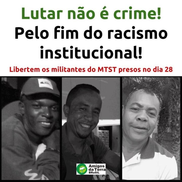 O Amigos DaTerra Brasil, como membro da Federação Amigos da Terra Internacional, presente em 75 países, e articulados regionalmente como Amigos da Terra América Latina e Caribe(Atalc Foei) pela Justiça Ambiental, denuncia as três prisões políticas da Greve Geral do dia 28. Solidariedade ao Luciano, Juraci, Rodrigo e suas famílias e ao Movimento do Trabalhadores Sem Teto.