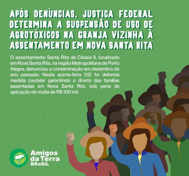 Organizações populares e entidades ingressaram com uma medida cautelar para suspender a utilização indiscriminada de agrotóxicos pelos fazendeiros vizinhos ao assentamento. A decisão liminar reconhece o direito dos agricultores assentados de produzir alimentos agroecológicos e determina que os órgãos responsáveis assegurem e limitem esse tipo de pulverização de herbicidas. A decisão também prevê aplicação de multa de 100 mil reais no caso de descumprimento da medida por parte do fazendeiro da Granja Nossa Senhora das Graças e determina que a União e o Estado do Rio Grande do Sul entreguem em 30 dias os laudos conclusivos das amostras coletadas.