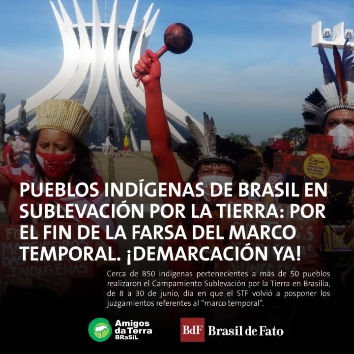 Cerca de 850 indígenas pertenecientes a más de 50 pueblos realizaron el Campamiento Sublevación por la Tierra en Brasilia, de 8 a 30 de junio, día en que el STF volvió a posponer los juzgamientos referentes al “marco temporal”. El movimiento indígena, que llegó a movilizar 1200 indígenas en Brasilia en la semana del 30 de junio y en cientos de protestas por todo el país, ha definido que las delegaciones de los diversos estados volverán en agosto, cuando el STF reinicie el juzgamiento.