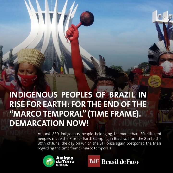 Around 850 indigenous people belonging to more than 50 different peoples made the Rise for Earth Camping in Brasília, from the 8th to the 30th of June, the day on which the STF once again postponed the trials regarding the time frame (marco temporal). The indigenous movement, which mobilised 1200 indigenous people in Brasília on the week of June 30th, and in hundreds of protests around the country, decided that the delegations from various states will return in August, when the STF resumes the trial.