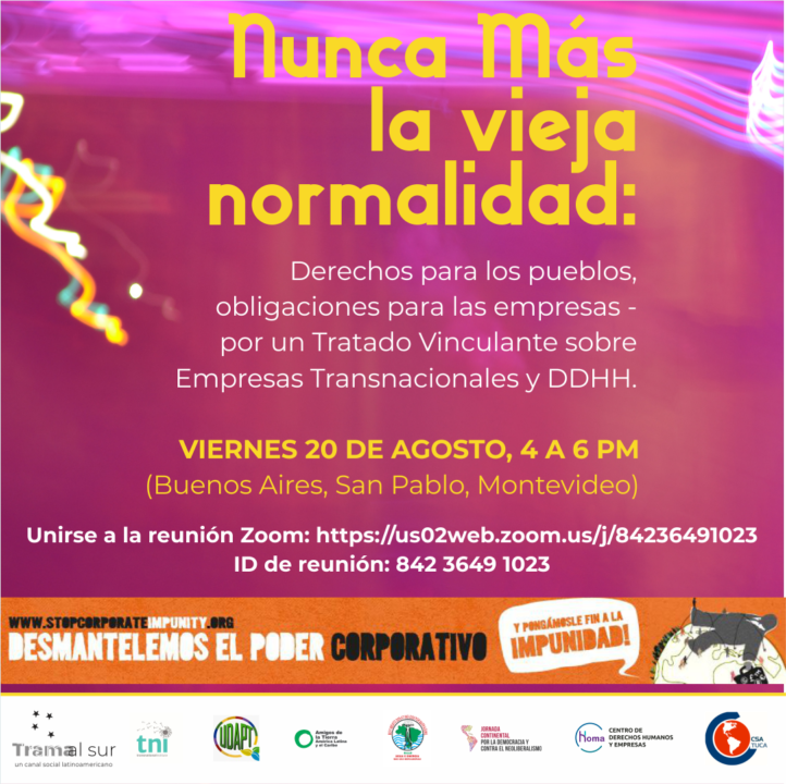 A discussão será uma instância informativa e formativa sobre as normas essenciais (mas, certamente, insuficiente se elas não forem acompanhadas por pressão social e mobilização popular, e Estados fortes para fazê-las valer contra o poder das empresas transnacionais) que devem ser incluídas no Tratado Vinculante sobre Empresas Transnacionais e Direitos Humanos (cuja 7ª sessão de negociação na ONU ocorrerá em outubro deste ano), explicado com base nas experiências de luta de movimentos sociais e advogados populares de destaque na região. Agradecemos sua participação e a divulgação desta atividade entre seus membros e aliados.