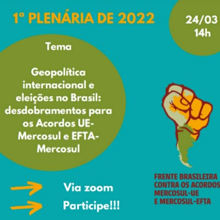 Nesta quinta-feira (24), das 14h às 16hs, a Frente Brasileira Contra o Acordo Mercosul-UE e EFTA irá realizar a sua primeira plenária de 2022. O debate pela população brasileira é fundamental, já que o acordo pode intensificar os processos de desmatamento, contaminação e de exploração de trabalhadoras e trabalhadores.