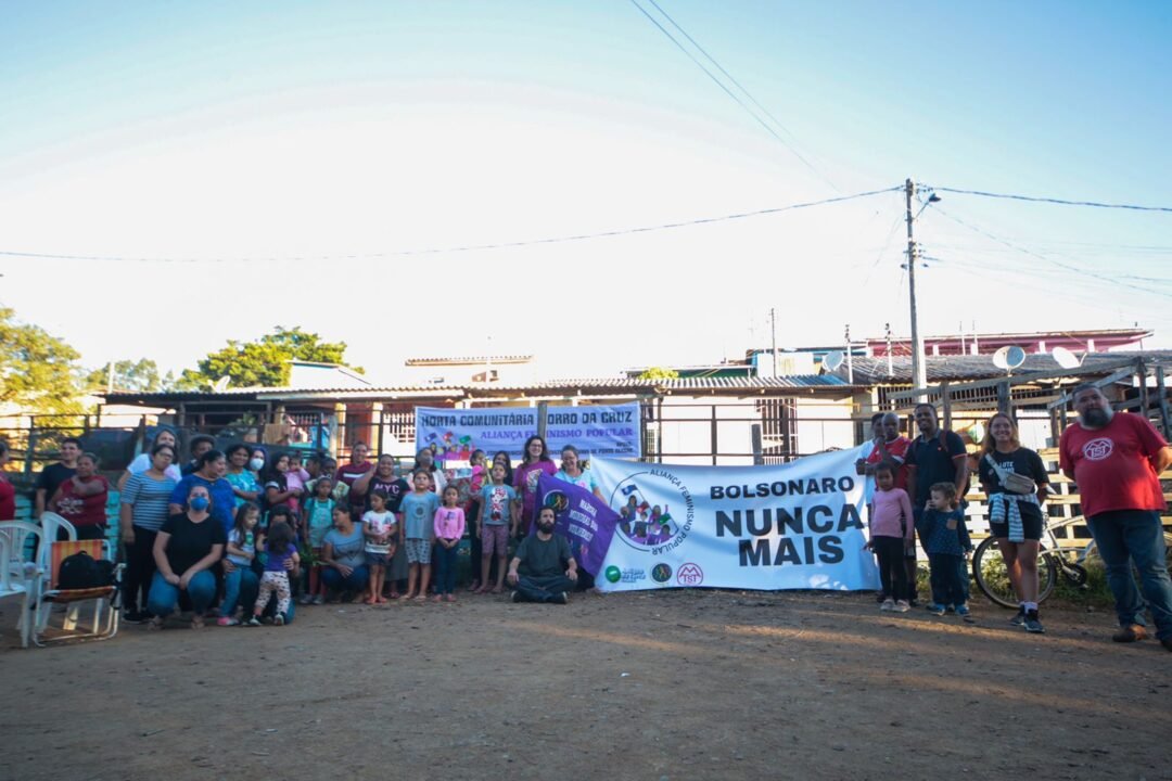 Investir na construção de soberania alimentar nas ocupações é uma forma de tecer alternativas concretas para a vida prática das mulheres. Ao longo do dia 24 de abril de 2022, as mulheres da Aliança destacaram a importância do direito à moradia e da alimentação como bens comuns, afirmando a urgência de avançarmos na produção de alimentos com qualidade e soberania. Letícia Paranhos, militante da Amigos da Terra Brasil e membra da Aliança, esteve presente na atividade do Morro da Cruz. Para ela, foi uma felicidade encontrar o avanço na continuidade da organização pela soberania alimentar na comunidade com o estabelecimento de uma cozinha comunitária, num momento em que no Brasil há tanta fome. Frente ao descaso do governo para com essa agenda, é de suma importância conseguir conversar e organizar, sendo esse um dos propósitos da Aliança Feminismo Popular, o de construir possibilidades dentro dos próprios territórios.