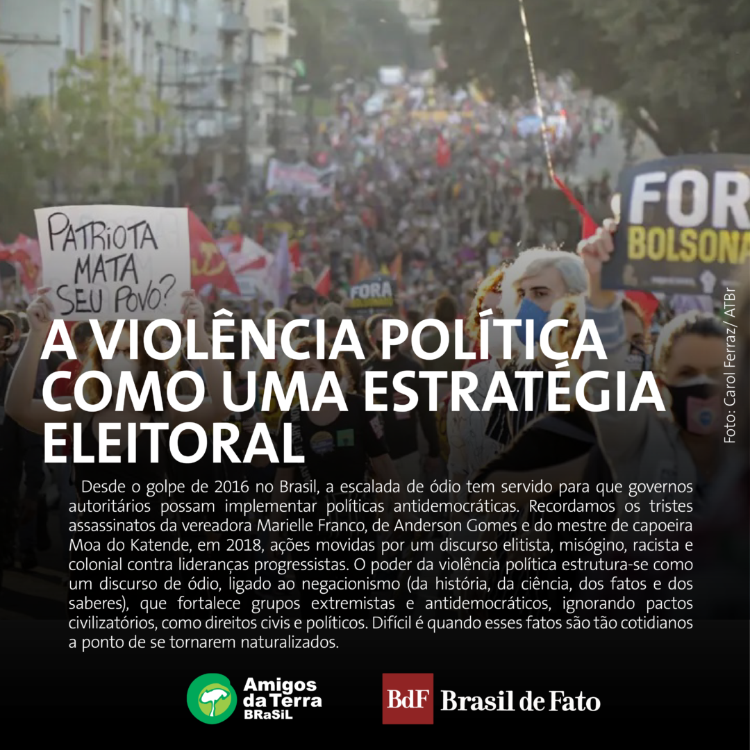 Vivenciamos o processo de impeachment da ex-presidenta Dilma nos afundando num mar de violência política. Como não recordar a brutalidade dos discursos no Congresso Nacional no momento da votação da cassação, dos quais entre eles estava o do atual presidente, saudando torturadores da Ditadura da própria presidenta? Ou ainda, o triste assassinato da vereadora Marielle Franco e de Anderson Gomes, no dia 14 de março de 2018. A violência política como arma de candidatos foi amplamente usada nas eleições de 2018, recordemos toda a misoginia sofrida pela candidata à vice-presidência Manuela D’Ávila, e está presente também nessas eleições. O assassinato do mestre de capoeira Moa do Katende, também naquele ano na Bahia, e todas essas ações são movidas por um discurso elitista, misógino, racista e colonial contra lideranças políticas progressistas, defensoras/es de direitos humanos e dos povos. Realizam-se, por meio verbal ou simbólico, no ataque nas redes sociais, na difamação da imagem, na distorção dos fatos e até em ameaças e atentados contra a vida.