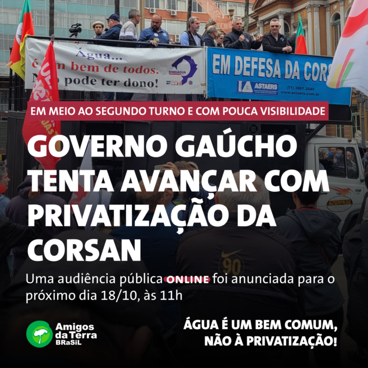 Na segunda-feira (3), uma convocação para discutir a privatização foi publicada no Diário Oficial do Estado anunciando a audiência pública a ser realizada no próximo dia 18 de outubro, terça-feira, a partir das 11h, de forma virtual. De acordo com o governo, a audiência tem por objetivo “garantir a publicidade de todas as condições relevantes da desestatização da Corsan, bem como colher sugestões e contribuições para o aprimoramento do processo”. Processo esse que avança quase sem diálogo social, em meio a um segundo turno das eleições. Vale lembrar que a não privatização da Corsan era uma das promessas do ex-governador Eduardo Leite (PSDB).