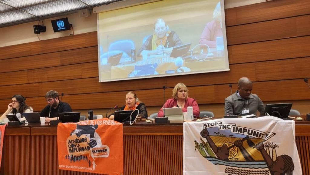 Evento paralelo organizado pela GIN e pela Campanha Global para Desmantelar o Poder Corporativo durante a 8ª Sessão de Negociações do Tratado Vinculante junto à ONU. Crédito: Amigos da Terra Internacional