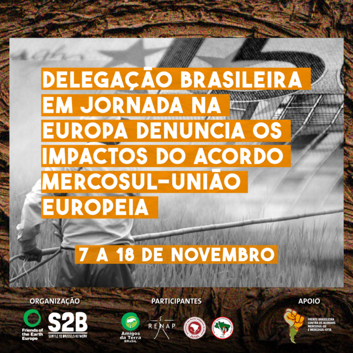 Entre os dias 7 e 18 de Novembro, em uma jornada na Europa organizada por Amigos da Terra Europa e a rede S2B – Seattle to Brussels, representantes de organizações e movimentos sociais brasileiros irão debater com parlamentares, jornalistas, acadêmicos e organizações da sociedade civil de cinco países (Holanda, Bélgica, Alemanha, França e Áustria) sobre os impactos do Acordo Mercosul-União Europeia sobre os Povos Indígenas, comunidades camponesas e produtoras agroecológicas, ecossistemas e populações atingidas pela mineração no Brasil. A ação tem como ponto alto o debate público com o Parlamento e com a Comissão Europeia na terça-feira (dia 8/11) a partir das 14h de Bruxelas/10 horas da manhã de Brasília, que poderá ser acompanhado online por este link: https://ep.interactio.eu/4jk9-e2nm-p7a1.