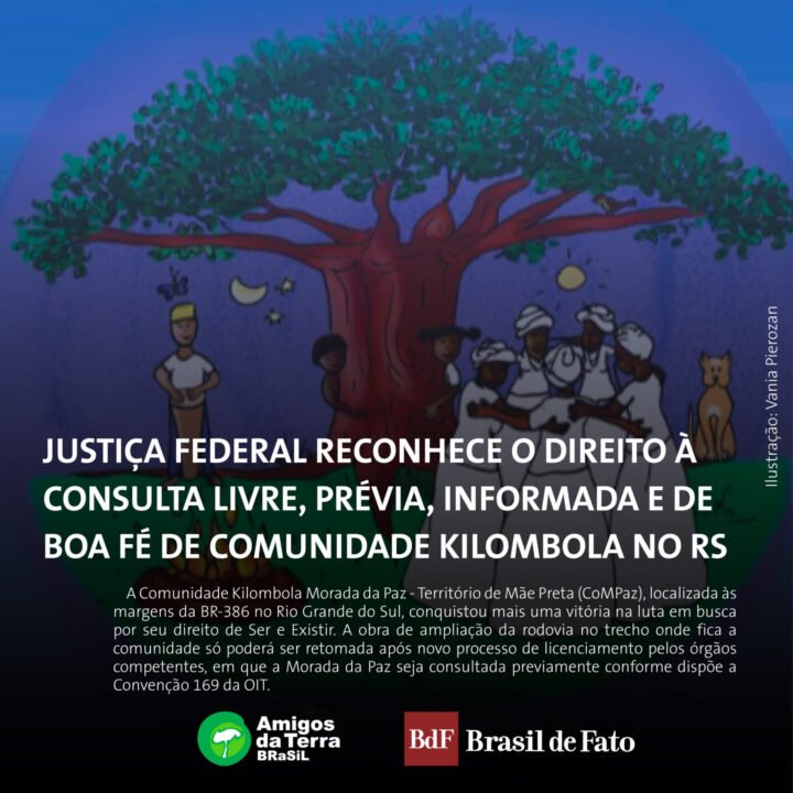 A Comunidade Kilombola¹ Morada da Paz – Território de Mãe Preta (CoMPaz), localizada às margens da BR 386 à altura do município de Triunfo, no Rio Grande do Sul, conquistou mais uma vitória na luta em busca por seu direito de Ser e Existir. No início de janeiro, a Justiça Federal no RS concedeu tutela de urgência suspendendo a obra de ampliação da rodovia no trecho que compreende os Km 405 a 415, onde fica a comunidade. A obra só poderá ser retomada após a realização de novo processo de licenciamento ambiental pelos órgãos competentes, em que a comunidade seja consultada previamente conforme dispõe a Convenção 169 da Organização Internacional do Trabalho (OIT). Os réus, entre eles o governo federal (Ibama e Incra) e as empresas concessionárias (CCR Via Sul e Empresa de Planejamento e Logística / VALEC), ainda podem recorrer da decisão.