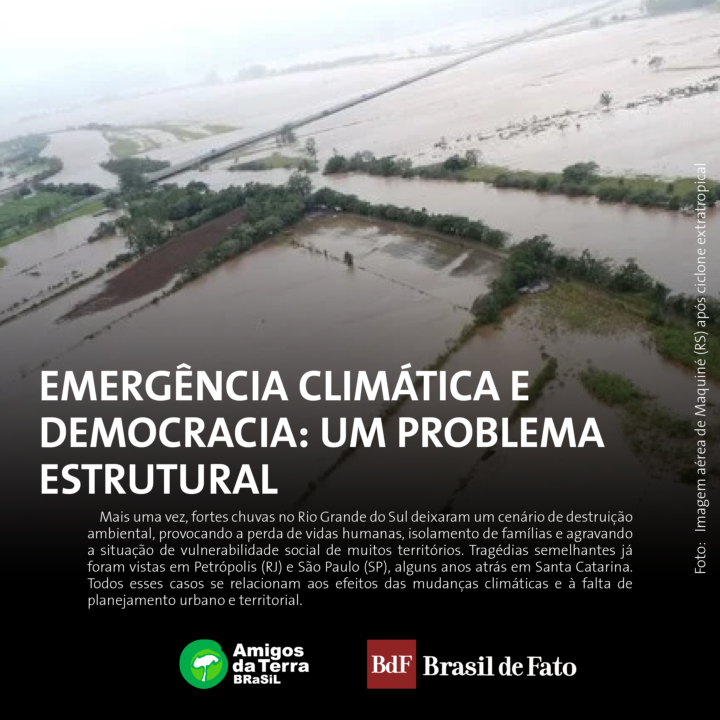 No mês passado, mais uma vez, fortes chuvas no estado do Rio Grande do Sul deixaram um cenário de destruição ambiental, provocando a perda de vidas humanas, isolamento de famílias e agravando a situação de vulnerabilidade social de muitos territórios. A passagem do ciclone, culminando com fortes chuvas, produziu um cenário de caos social, deixando 50 famílias desalojadas no município de Maquiné (RS), 418 mil residências sem energia elétrica, estradas bloqueadas e 13 pessoas mortas. Os efeitos climáticos nos centros urbanos têm sido uma constante no país. Tragédias são vistas em Petrópolis/RJ, São Paulo/SP, alguns anos atrás em Santa Catarina. Todos esses casos se relacionam aos efeitos das mudanças climáticas e à falta de planejamento urbano e territorial.