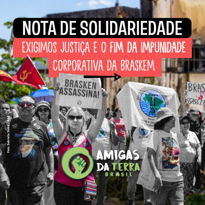 A Amigas da Terra Brasil chama a sociedade a tomar ações frente à dor e ao sofrimento da população. Que divulguem, colaborem e participem nesta luta das afetadas pela Braskem e não permitam que este crime passe impune, seja colocado de lado e assumido por quem vive na pele os seus impactos.