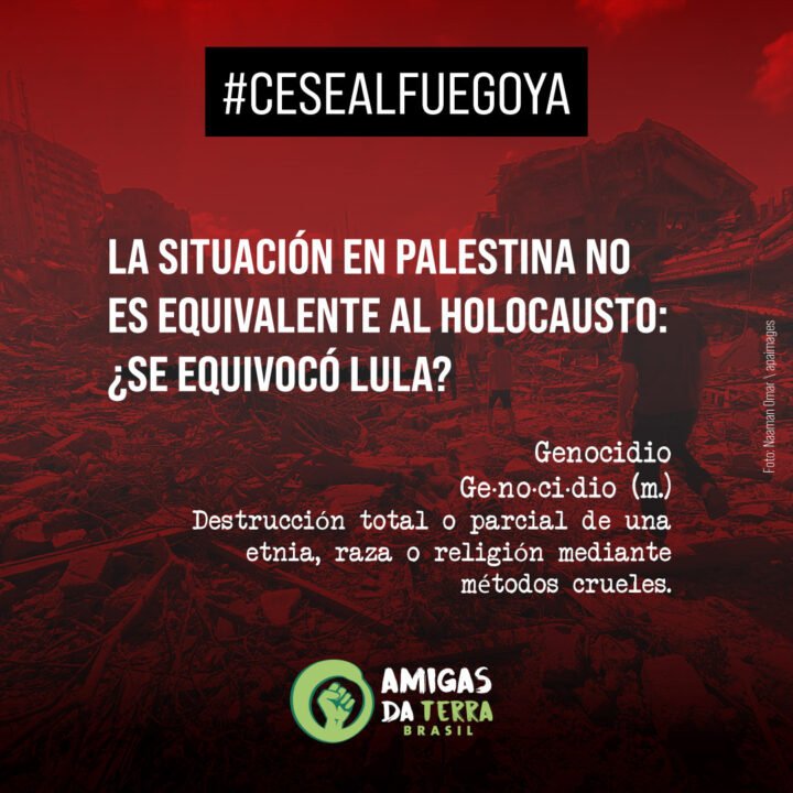 Por lo tanto, Amigas de la Tierra Brasil expresa su apoyo a la declaración del presidente Lula y rechaza cualquier tipo de retractación por parte del gobierno brasileño hacia el criminal de guerra Benjamin Netanyahu, primer ministro del estado terrorista, asesino y genocida de Israel.