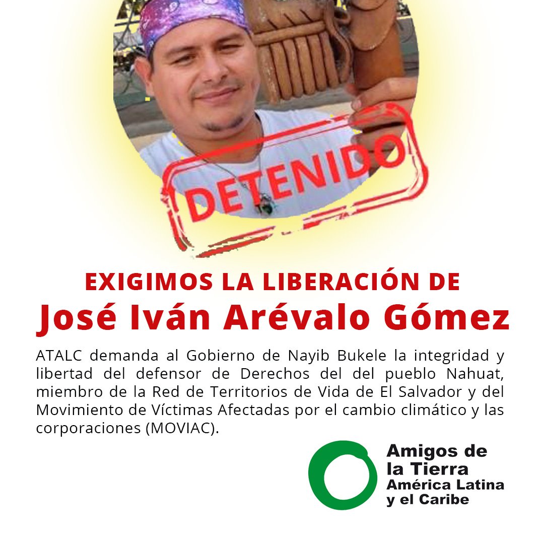 A Amigos da Terra América Latina e Caribe (ATALC) e a Amigas da Terra Brasil (ATBR) se unem às ações de denúncia contra o governo de extrema direita de El Salvador, onde ontem (29/08) foi detido, arbitrariamente, José Iván Arévalo Gómez, defensor dos Direitos dos Povos Indígenas, do povo Nahuat, e membro da Rede de Territórios de Vida de El Salvador e do Movimento de Vítimas Afetadas pela Mudança Climática e Corporações (MOVIAC).