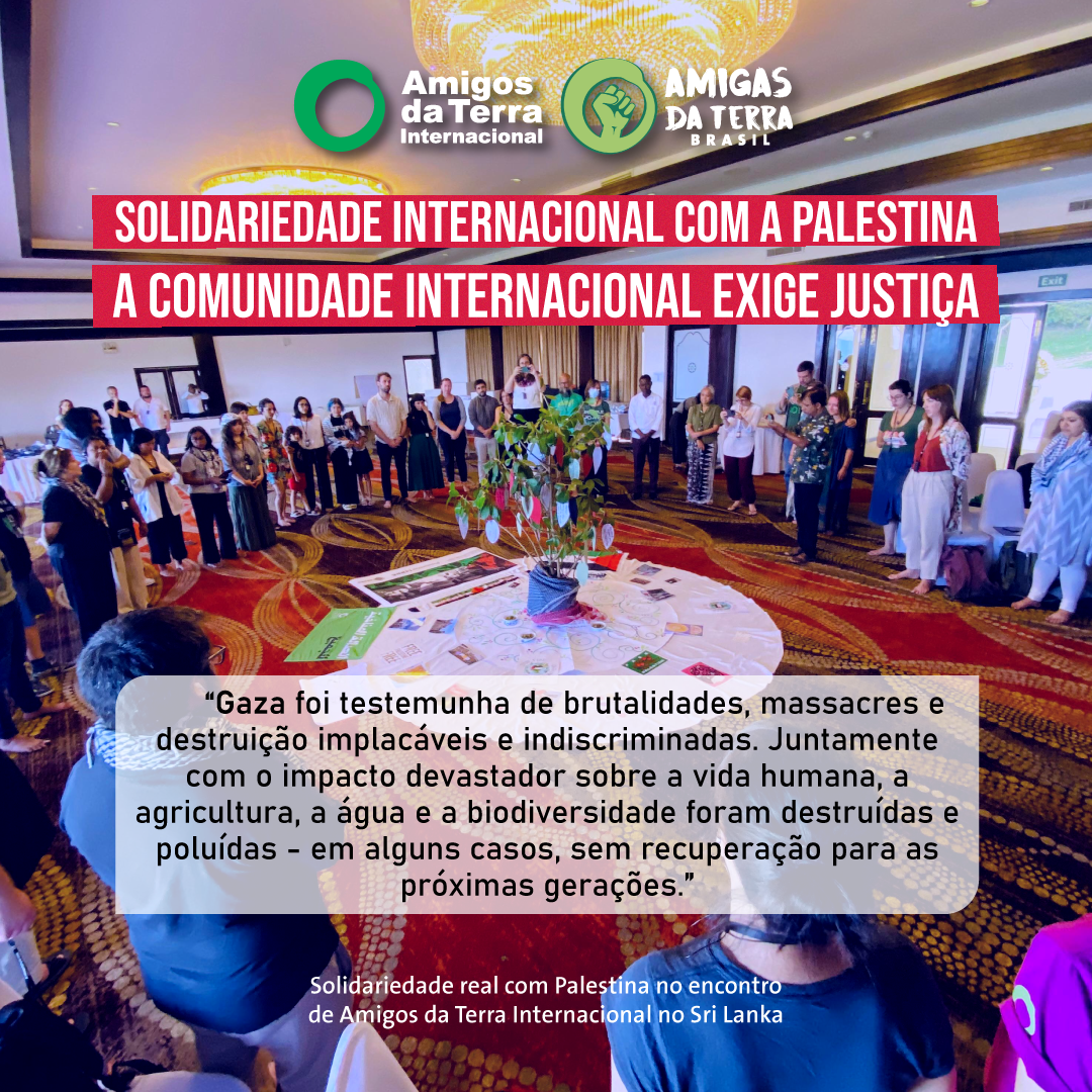 Em solidariedade à nossa organização membro, PENGON, e a todas as pessoas afetadas, a Amigos da Terra Internacional está convocando uma mobilização internacional para demandar a todos os governos, especialmente aos poderosos aliados de Israel: