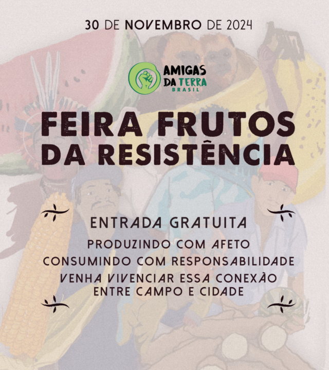 Unindo aromas, sabores, cultura e muita luta, o dia 30 de novembro será marcado por mais uma edição da Feira Frutos da Resistência. A Feira existe como um mecanismo de encontro, assim como de partilha de informações dos enfrentamentos e resistências que se dão no Bioma Pampa, na Mata Atlântica e na metrópole de Porto Alegre. O encontro será na calçada da Casanat, casa sede da Amigas da Terra Brasil (Rua Olavo Bilac, 192, Porto Alegre/RS) e acontecerá das 13h às 19h, mesmo com chuva. A proposta é difundir a agroecologia e a economia solidária, informando a quem se aprochegar e tornando possível um espaço de diálogo e de articulações políticas.