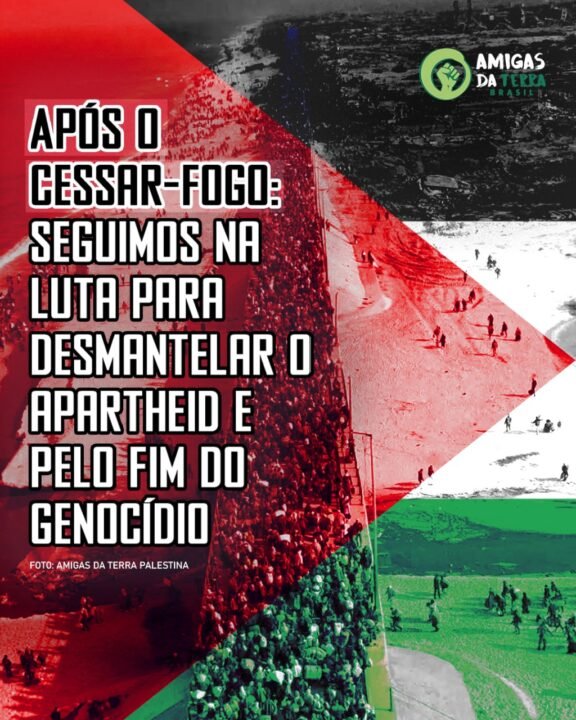 A Amigas da Terra Brasil, integrante da Amigas da Terra Internacional, recebeu com alívio a notícia do novo acordo de cessar-fogo. Por mais que este passe por um processo de intensa fragilidade, ameaças e contradições, ele é fundamental para assegurar melhores condições na construção da luta palestina. Expressamos o sincero reconhecimento a todos nossos grupos membros, pessoas aliadas e simpatizantes, por nos apoiarem na defesa dos direitos de pessoas palestinas e por lutarem conosco por justiça na Palestina. Nos solidarizamos à causa e seguimos no compromisso de fortalecer o apoio à Pengon – Amigas da Terra Palestina e à luta do povo palestino por sua dignidade, soberania e território.