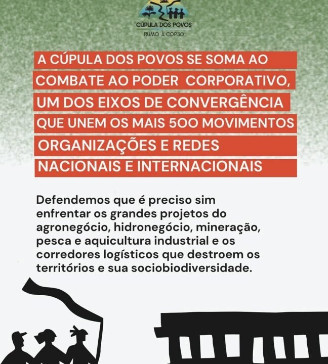 A Cúpula dos Povos se soma ao combate ao poder corporativo, um dos nossos eixos e um dos principais desafios da agenda climática global. Nossa luta é contra os grandes projetos do agronegócio, hidronegócio, mineração e logística que destroem territórios e biodiversidade.
