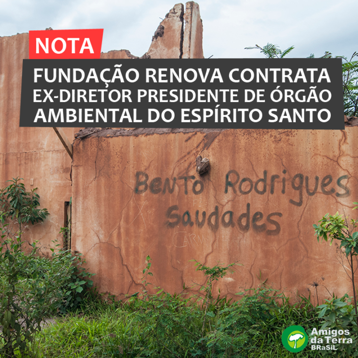 Nós, movimentos sociais, sindicatos de trabalhadores, grupos de pesquisa, organizações não governamentais e indivíduos, vimos publicamente alertar aos órgãos competentes quanto à contratação do ex-diretor-presidente do Instituto Estadual de Meio Ambiente e Recursos Hídricos do Espírito Santo (IEMA), Jader Mutzig Bruna, pela Fundação Renova, conforme noticiado em